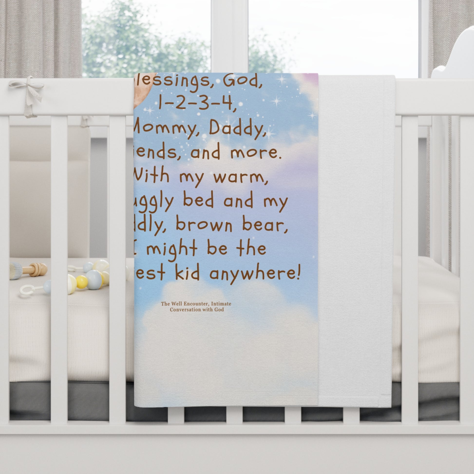 Wrap little ones in a gentle, storybook moment. This soft fleece blanket carries a sleepy, pastel scene—a cuddly brown bear floating with balloons across pink clouds—paired with a simple, heartfelt rhyme about counting blessings. It feels like a quiet lullaby: warm against tiny skin, light enough for stroller naps, and sweet enough to be a child’s new favorite cuddle companion. The one-sided print keeps the artwork bright and clear while the plush fleece on the reverse stays cozy and soft, making bedtime, nap time, and quiet moments feel tender and calm.